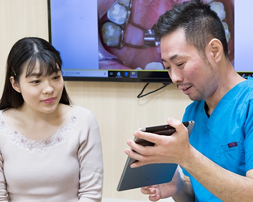 レントゲンや模型などの資料を取り、診断をして、診断結果を患者さんにお話しいたします。